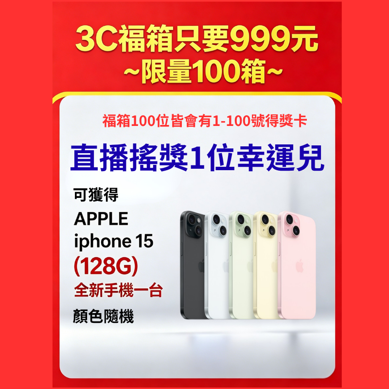 3C福箱999元!搖獎1位中iPhone15(128G)全新手機!限量100箱!
